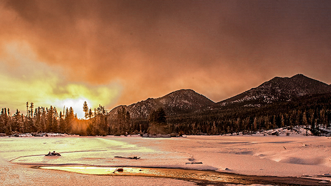 Good composition, the creek from right side corner and lead us go to the sun. Couple thing I would like to adjust and retrieve details of mountain. Also, The sun light seems too yellow, although it lake gold. I am more like yellow with orange color. The sun is getting set down, usually in this moment the sunset color is more orange. |