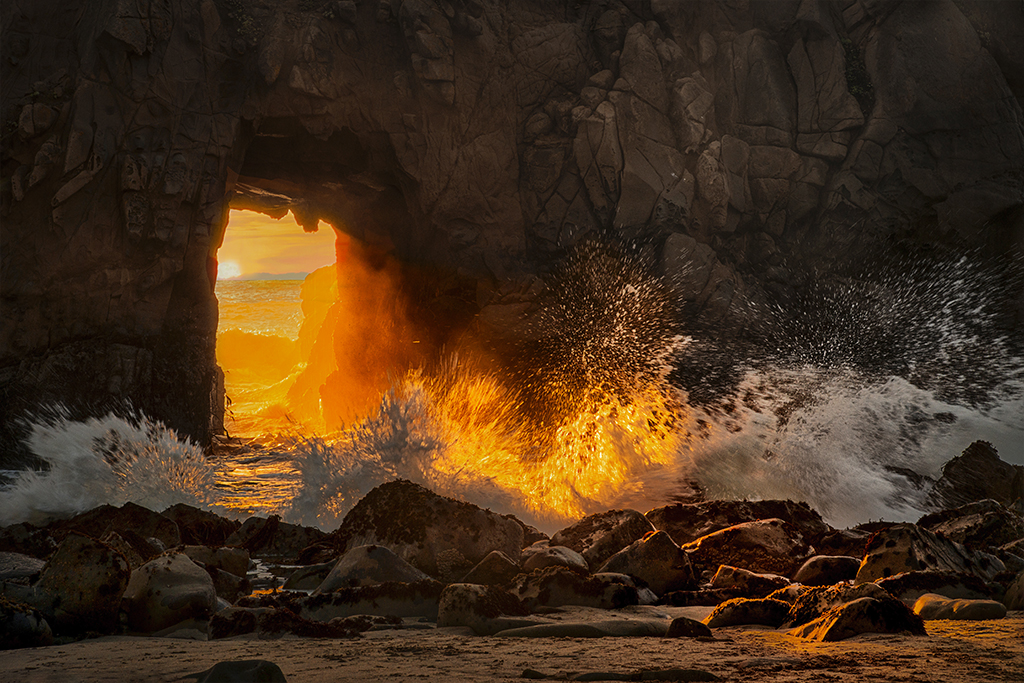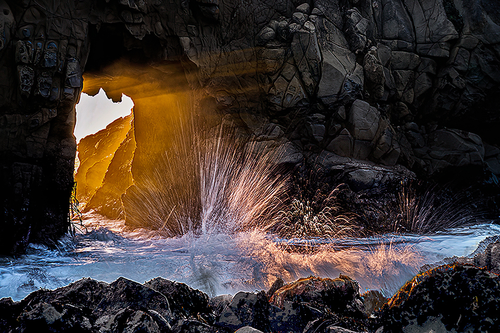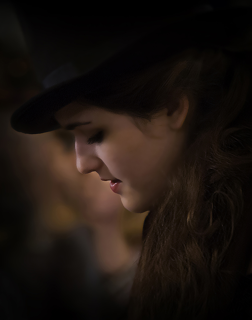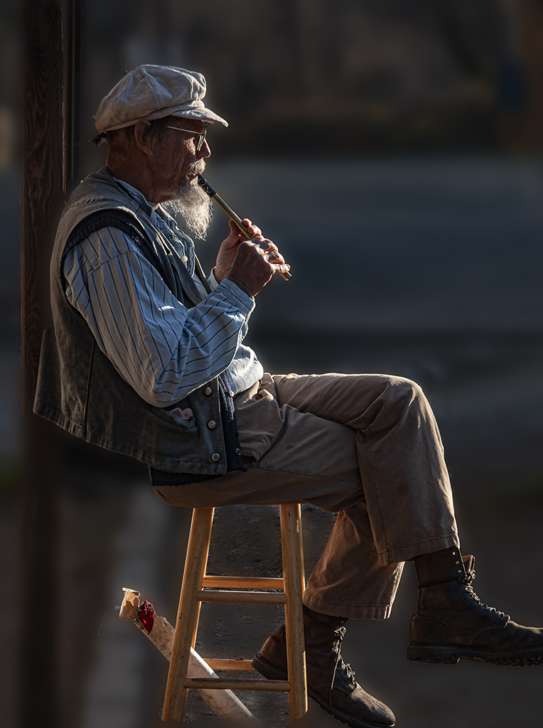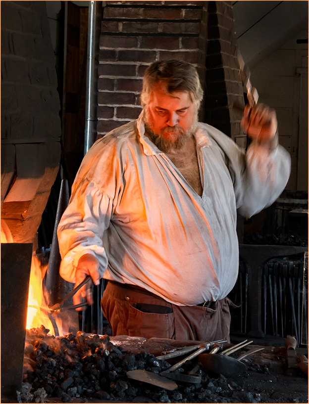 Very nice a telling story image. I like more original, it has more frame color reflected on his body, that created a stronger working shop atmosphere. The moving blurred hand express he is in working action. I also like he is looking the framing area. |