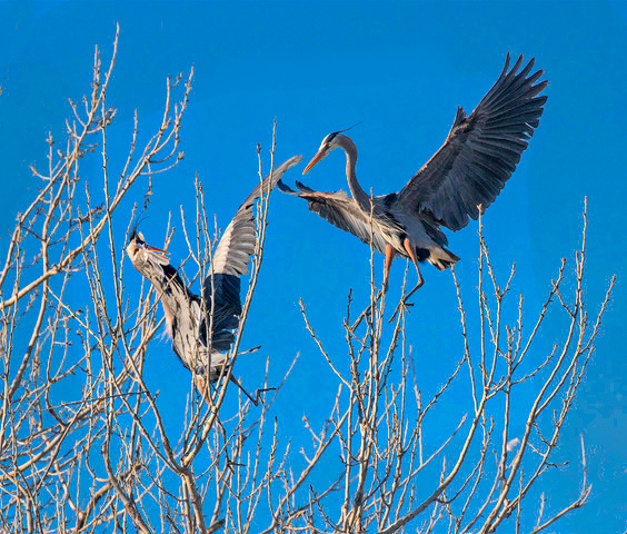 Nice action capture. I agree Grace's comment to make background sky darker. Also I would lighter under wing of right side bird. I also removed some branches at right side low corner and left top corner |
