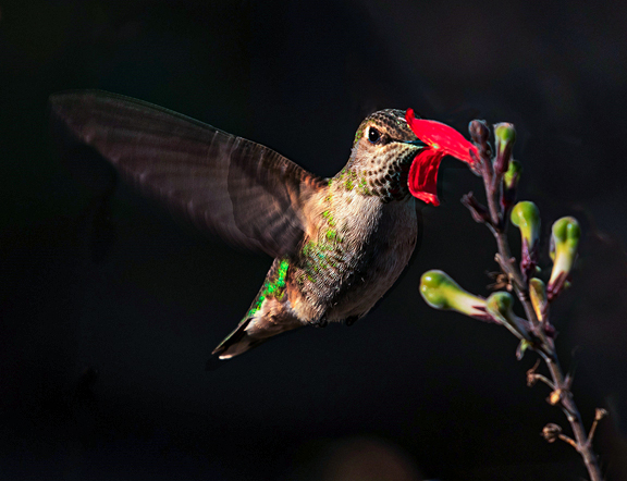 Capture humming birds is not easy work. You capture a perfect moment. It's eye and body are very sharp except the wing, that added a moving feeling. I would remove the little piece of stem above it's head and brighten the wing a little bit. I feel the whole image is in warm tone, or might change to cool tone a bit. |