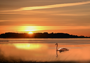 I would use the left part of sunrise image with sun as a new background, then flip the swan and add it on. |