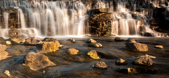 I agree Tom's comments to tone down brighter rock in the lower front. Even I would crop off lower down side part, because the front view too big to compare with water fall. Also I would tone down all the brighter rocks and more brighten the water falls. |