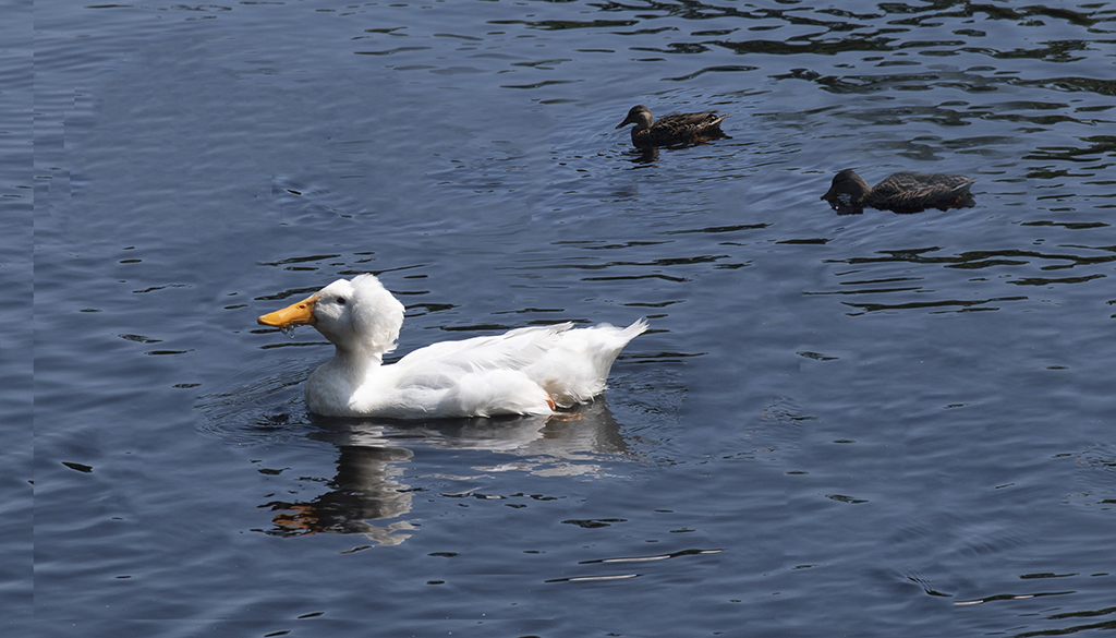 I agree Barbara's comment, the white duck is more interesting and it is a major object, eliminate the other two. The other way I would reduce two ducks sizes and move to up left corner #1. Also might rearrange their locations, like move the white duck in leading position in front and the other two in following location #2. |