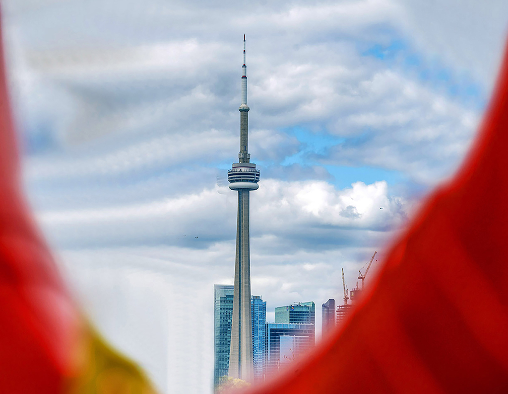 Use empty space to create a frame is a good idea. Use partial blurred life buoy to create a frame might not a perfect framing. I would crop out some of the top and both left/right side to concentrate viewer to CN Tower. |