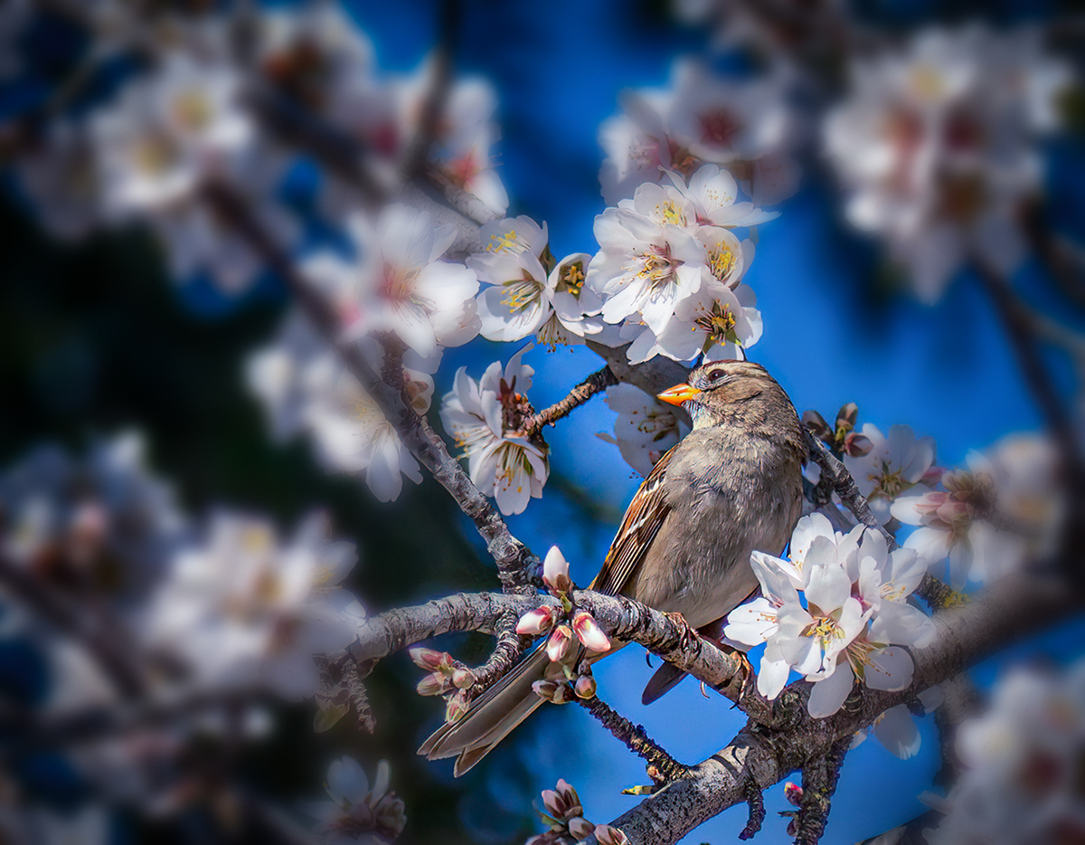 Beautiful little bird and spring flowers. Nice shot! For the whole image, the flower background might be too crowded and warm tone of whole image. I would increase the cool tone of image and blurred the background around the bird to get standout from crowded flower background.