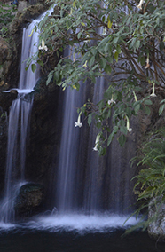 This is a pleasing waterfall image with falls nicely blurred and foliage quite sharp for a handheld shot. The placement of the flowering tree itself does not bother me, but I agree with other members that it blocks and overwhelms the falls in back. The image also has a cool, bluish cast which can be corrected by increasing the color temperature.