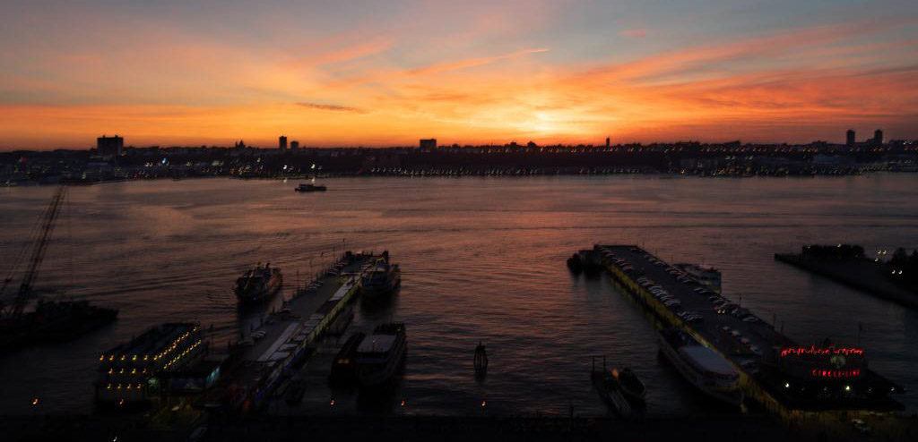 Great capture of the sunset with vibrant colors! All features at bottom - piers, even the crane, act as leading lines taking you into the picture towards the sunset. I think the composition could be strengthened by cropping downward from the top, turning it into more of a panorama. See revised image below. In this image, I have also toned down the red sign.
