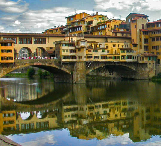This image has a lot of potential with its detailed buildings, bridge and reflections. I agree with Christina's changes - especially toning down the blown-out sky. I think the bridge (and its reflection) could stand on its own as a strong second picture (see image below):