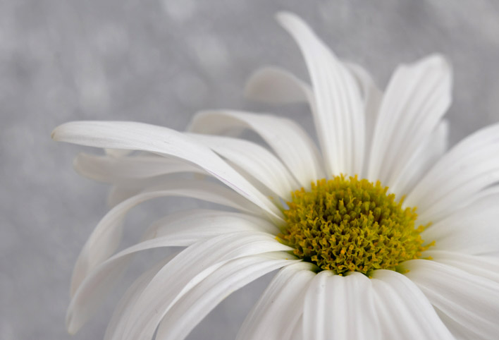 Diana, this flower image has definite impact! The center is sharp and its vibrant color draws your attention. I also like the textured background; however, I think it could be darker to allow the white flower to stand out more. I agree that blurred petals on a flower are perfectly fine, but to my taste, they look better in the back of the flower versus the front. You can always deal with blurry petals by simply cropping them out as I did here (see image below). Since the petals are sharpest in the upper left corner, I cropped in from right and bottom. This also placed the flower center off-center to yield a more dynamic image.