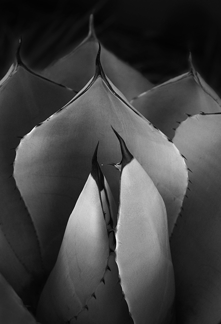 Donna, perfectly exposed image of succulent!! Use of black-and-white emphasizes the tonal gradations, not only in the spikes, but in the leaves themselves. I find the 2 leaves in center (beautifully outlined - do you see "2 penguins in a courtship dance"?) the center of interest, and the 2 bright leaves at lower right and left somewhat distracting. A bit of careful cropping plus burning/cloning (at lower left) may increase the image's impact (see my attempt below):