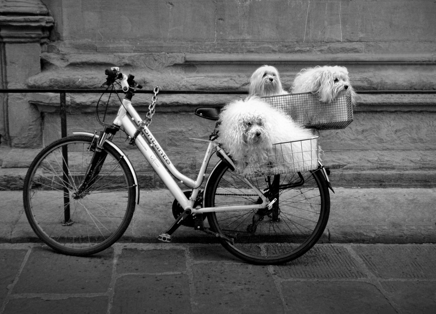 Hello, Michael. I've dropped in from Group 51. I like your image and I prefer the mono version. If your intended subject was the dogs and not the bicycle - and as Diana mentioned - it would be good to have a bit more space on the right side to help to remove the tension of the out-of-frame glance of the dogs. I hope you don't mind that I fiddled a bit with your image. I used PS to add to the right and subtract from the left. I also used gradients to push the viewer's eye to the white dogs. |