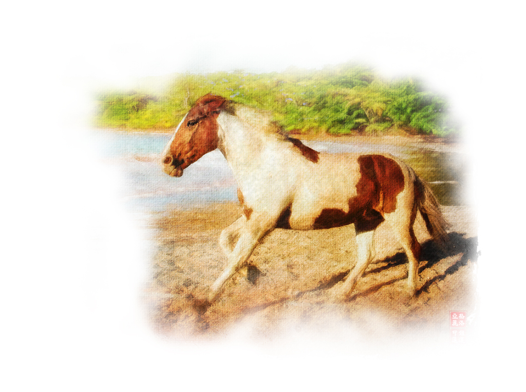 Wonderfully done Gloria--as always. My only observation is the very "controlled" background, which is watercolor is typically missing. I posted a picture on Tom's painting that is not mine to depict what the sense of a water color "look and feel" is though I tried to apply that to your horse a tad with just a 1-minute deleting in Photoshop. So my reduction is not even close to what a real watercolor would be like but it captures (or at least I tried to capture) the importance of the irregular background.