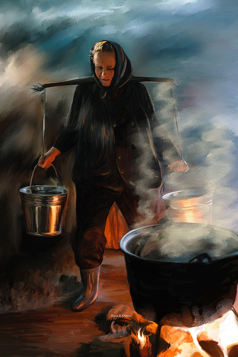 Thanks Tom for your suggestion. I think the two painting depict a different feeling. The one you created depicts the pain from the heavy weight but not the heat and burning. Note the redness disappeared from the image though her hand is still reflecting red. I think that while removing the burning red did bring more attention to her face, it removed something that I miss. To me it reduced the environment to a "common" fire in the open for cooking. Don't you agree? Whereas the original could even be metal melting for all I know. |