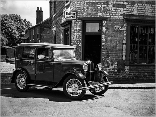 This is a nice representation of a vintage auto in appropriate surroundings. I made 4 minor adjustments: 1) Overall Brightness/Contrast, 2) Selected the 2 signs on the building, then Image -> Auto Tone, 3) Darkened the bright object at the center left, and 4) darkened the road. |