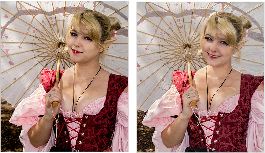 I agree with Stan's evaluation.The Renaissance Fair you attended takes place annually about 20 miles south of where I live, and I've also photographed this lady. I try to "work the subject", even though a few people don't like it. Here is an example of the same subject taken in 2012. It looks like she's wearing the same dress. Comments welcome. |