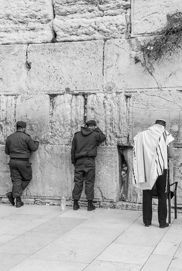 Norm< I often like negative space in images, but you can crop a bit off the top and slightly more off the bottom to retain the relative placement of the 3 men in the image (see VF). Great composition - catching the differing poses and the juxtaposition of 2 'warriors' with a religious man - but all praying just the same. Really like the angle of the shot that creates those leading lines in the pavement they invite - no, ORDER the viewer to go to the wall! Good dynamic range with just enough dark tones and a dash of white in prayer shawl to stand out against the very light background. Nice image! |