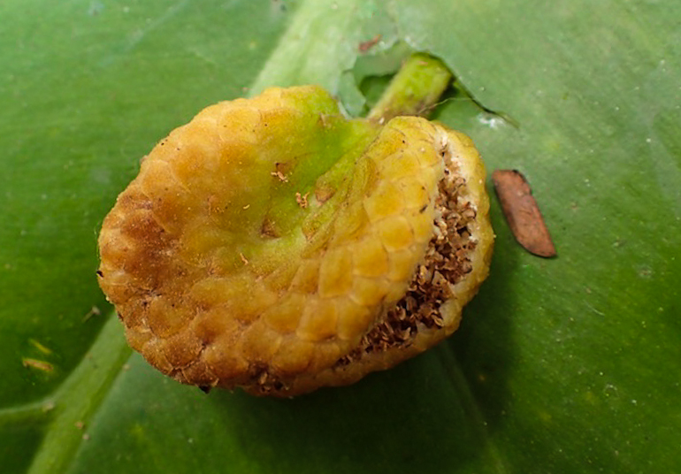 A very unusual fruit! I agree with Carol - nice contrast of green and yellow, with a touch of brown. Leaf veins add diagonal interest to circular fruit body. Not quite as sharp as you would probably get with you DSLR, but a good option using your 'macro' feature on the point and shoot for travel to give you a very nice image. I also think you need to crop the abrupt brown area off the right, and do a little editing to clean up the leaf a little. I adjusted the image - increased shadows, decreased highlights a little, increased contrast. I cropped it and also rotated the image a bit to make the veins sit more diagonally. I cloned out some of the spots, but kept some so it kept the realistic look. I also used the clone tool to move the 2 yellow dashed lines from the right side to the left lower area. Balances the brown bit I left in the upper right. See VF. |
