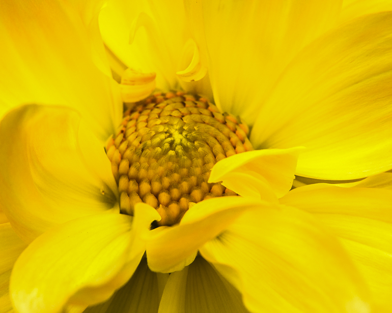 In your face sunshine! Really like the flower you chose and the way you opted to capture it. The swirl of the petals around the middle adds movement. Echoes the Fibonacci swirl of the center elements. The subtle orangey lines on the petal tips add nice dimension and texture. Nice how you kept some of the under layer petals at the bottom - adds interest to composition. I played with it and edited it differently. Your version ahs a softness to it; my version brings down the highlights just a bit and brings out some of the detail and shadows more distinctly. Its a personal interpretation; see what you think in the VF image. Love this shot! |