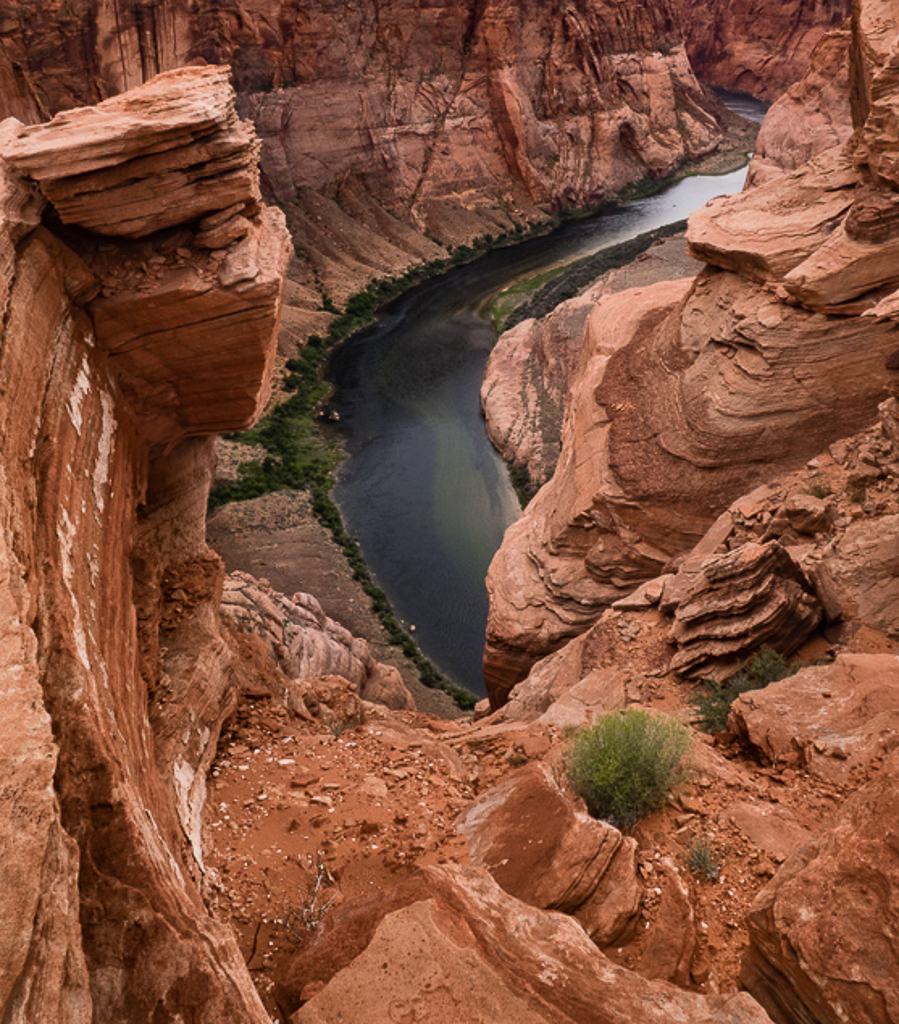 Three great things jump out at me from this image: the colors of rust and green; the swirled edges of the cliff imparting a real dynamism to the image; and the S curve of the river drawing the eye through the image to the horizon. Great job! Nice touch of the little green shrub - alleviates all the rusty red of the rock. Since the sky is not that interesting, wondered what it would look like without it? - see VF. |