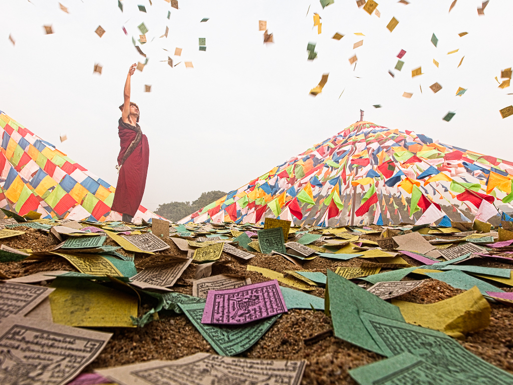 What an interesting angle on this action Carroll! At first glance, I thought you had created this image from separate elements - then I realized it was an actual photo. You clearly anticipated this composition with a super outcome. Using the pieces of paper as a foreground is delightfully unexpected. Placing the monk just aside the vortex of the 2 triangles is perfect placement. The color of the triangles adds great spark to the dull sky. The pieces of paper in the sky echo the large ones on the ground. I'm wondering if the 'usual Chinese sky' means there is a lot of pollution, because the image itself - the monk - seem to be a bit hazy. I attempted to de-haze a bit by increasing contrast...see VF. I think all it really does is darken the monks robe and makes him stand out a tiny bit more. |
