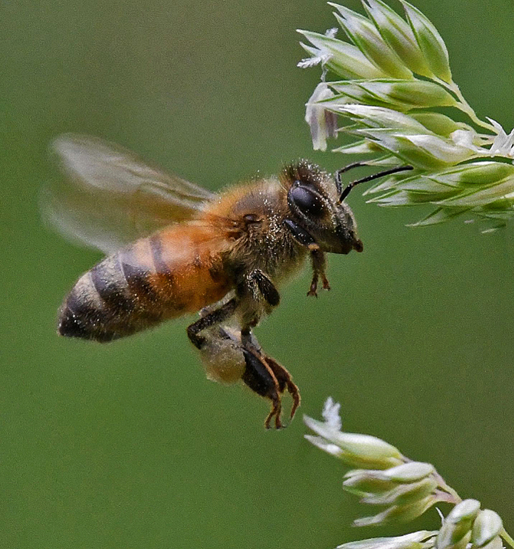 Interesting that even at 1/1000 sec shutter, the wings are still not frozen - amazing how fast they must bee (pun)! But you caught the rest of his body very sharp pretty much from front to back - exquisite detail in all parts. The hairs and even the pollen grains are very distinct. Nice light highlighting its back. The colors you captured are wonderful - that burnt orange -gold body against the medium soft green is super. And the plant seeds are the perfect touch - green and white adding a nice brightness to the composition. Something that catches my eye is that the seeds are cut off at the upper margin. If this was a crop, perhaps you can correct that. My eye is also pulled to the convergence of the bees 'feet' with the seed head. I have cloned that out in the VF to clean it up visually. I also removed those 2 pink dangling seed hulls - they really draw the eye away from the bee. I removed a tiny speck of white from the upper right corner. One thing I learned in a photo workshop I took is to always watch for convergence of major compositional elements and try to avoid them if at all possible. And to always make sure the photo margins are clear of unnecessary bits of thing poking in or out of the image. See if you think its an improvement... |