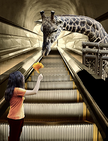 Wonderful composition. I like the way the giraffe's long neck and the long background complement each other. I wonder how the image would look if the girl's clothes