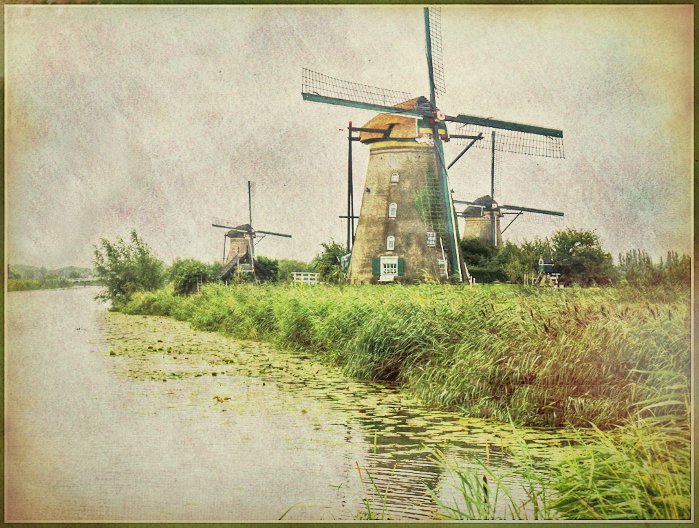 It was Topaz Texture Summer haze after I had darkened the sky using a 50% grey layer, opacity overlay and painted with a black brush at 15th opacity, then lightened the grass and windmills with a white brush at the same opacity. |