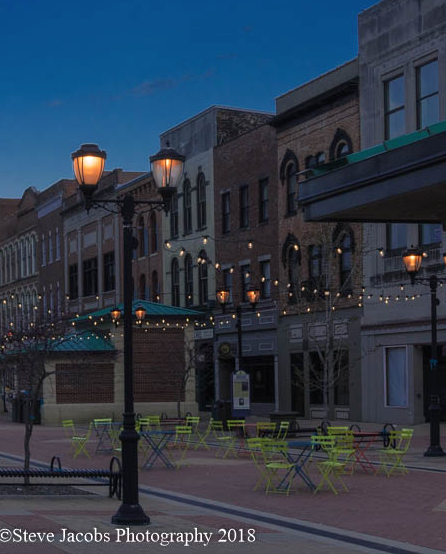 I agree with the above comments about cropping off some of the sky and also about enhancing the yellow chairs and lights on a string. I would also consider cropping out the moon and making it more of a square format and making the street scene the main emphasis. |