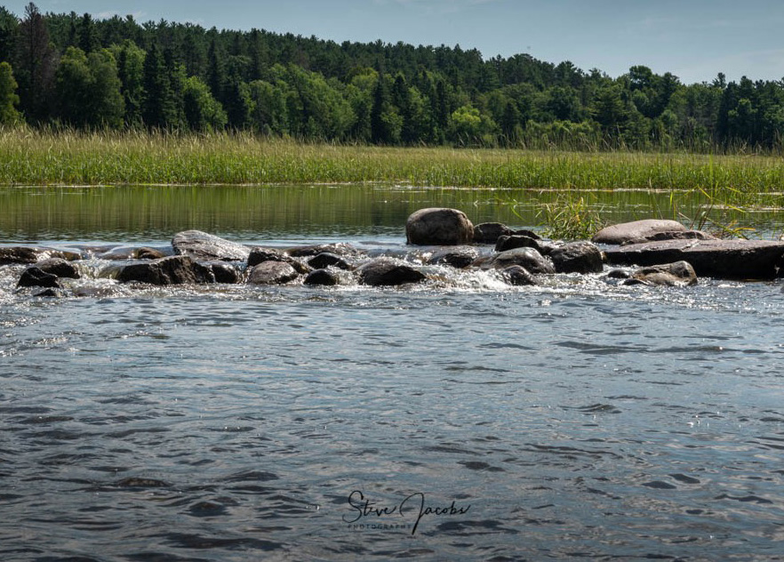 It is a peaceful picture of a summer day. I would delete some of the sky so that my eye focuses on the rocks and the rippled water in front of them as that is what seems peaceful to me. I would also crop from the sides so that my eye goes right to the large rocks in the center portion. |