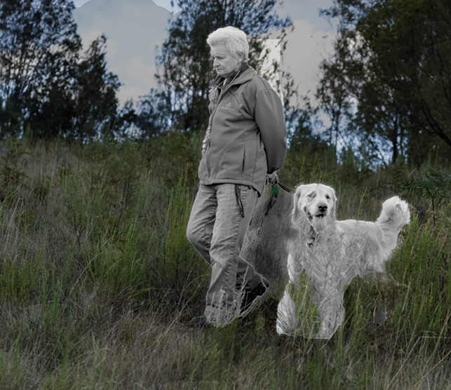 The. concept is wonderful. The older woman and tge dg seem be thinking about two different things for sure, The woman is contemplating, as you suggest, while the dog is vert interested in his surrounding. I think that the subject needs to be lighter and the background darker and maybe a little blurred to take away from the same cast as the subjects. I am attaching a rather badly done idea of what I mean. I also dared the sky and cropped it. |