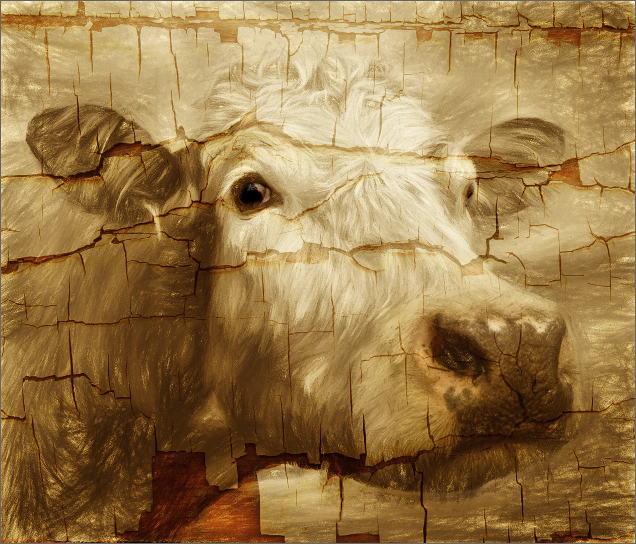 I did a similar thing a while ago, using different Topaz effects - here's 'Brown Cow' using cracked paint: |