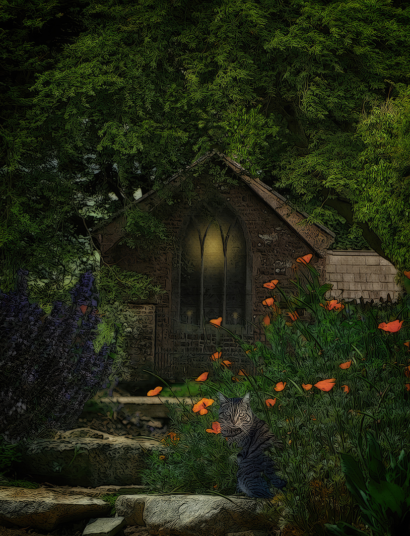 A fine composition which works very well. The lights in the chapel are a nice touch, as is the cat.