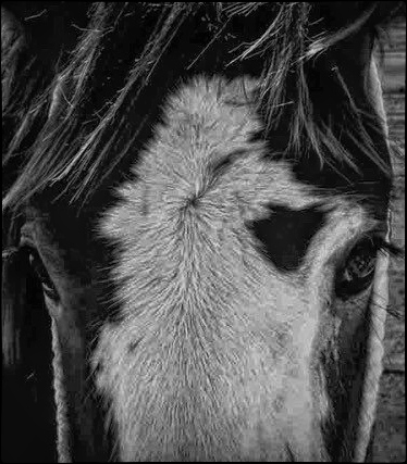 Since this really seems like an abstract to me, I would go all the way. Crop in to just before the eyes on each side and darken the background on the right. I used Nik color Effect Tonal Contrast and Detail Enhancer and a vignette. |