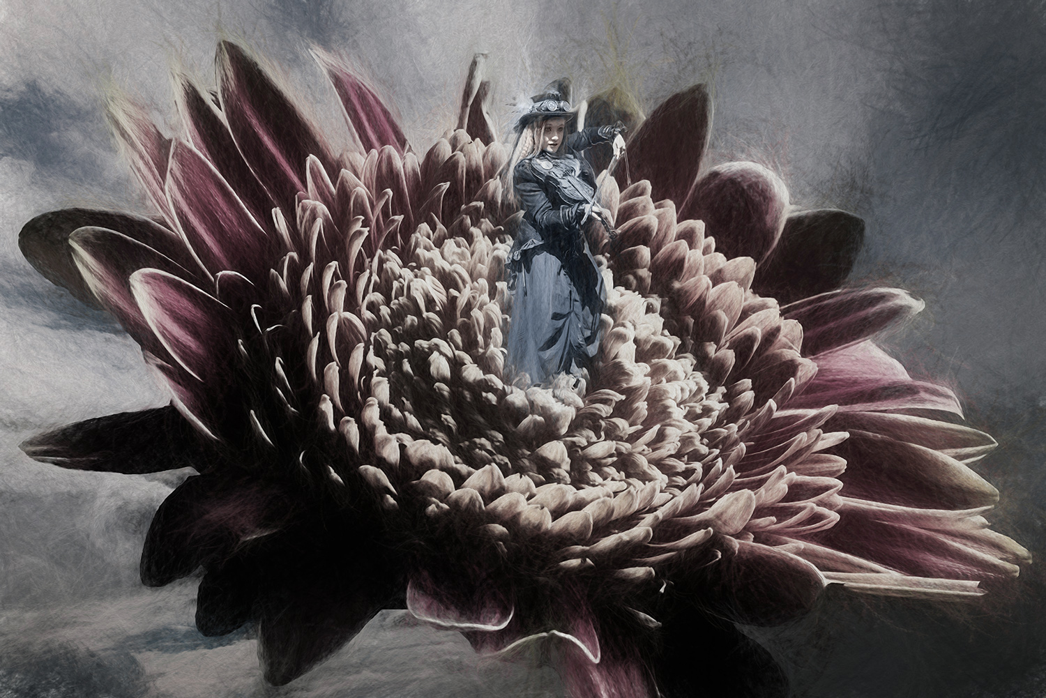 Steve, the flower is beautiful,and the bluish texture in the background really adds to the overall image. Jan's idea to elevate the fiddler above the flower works well to balance the image better. I agree with Georgianne that the overall color palette has too much sameness. I used selective color to increase the pinkness of the flower to give more contrast between the fiddler and the flower. Overall you have produced an interesting image. |