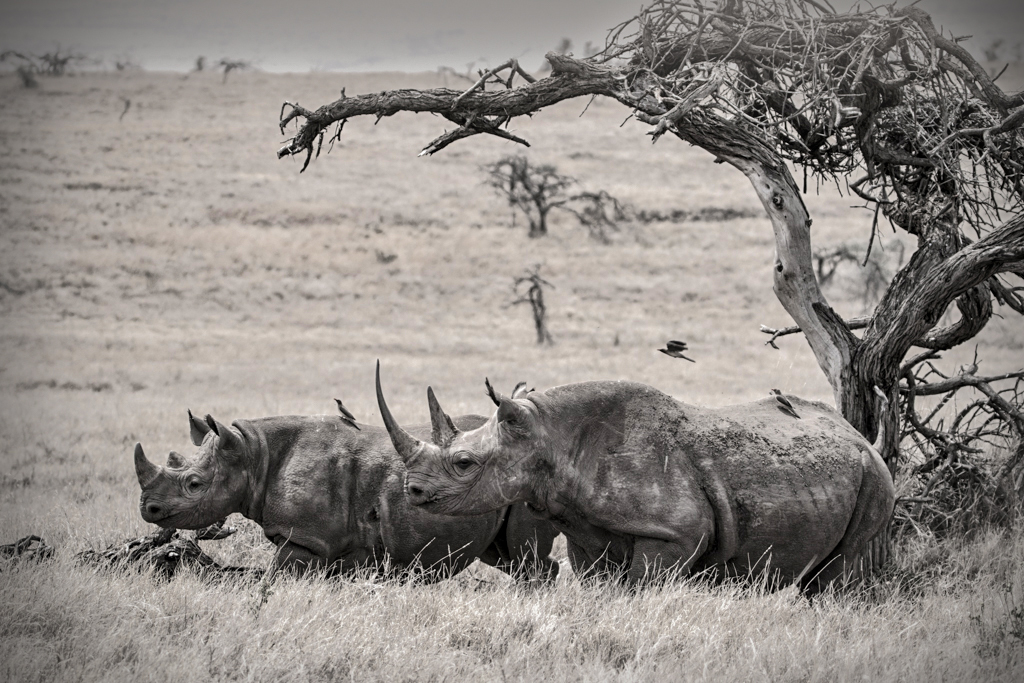 The black and white conversion works well for the rinos but has made the background too bright. the tree is a nice frame and the birds add interest. I have tried the camera raw filter, a gradient and vignette to try and tone the image down. |
