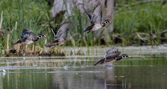 Nice capture, the ducks appear sharp, and it is nice that each duck is in a different mode of flight. However, as already said the background is very distracting. Maybe if you cropped the image and concentrated on the ducks in front it would present a better image. I cropped it, used the camera raw filter, curves and selective color to better emphasize the ducks. |