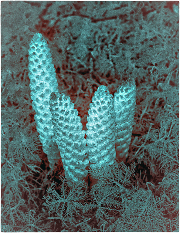 Phil, your original 3 is the image that pleases my eye the most. The lighting is beautiful. The final image presented has too much brightness, in my opinion.I added a second inversion which brings the image back to the blue tones with more detail in the foliage around it. The red works for me too, but I was unable to remove the extreme brightness around the stalks. |