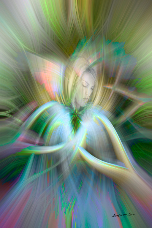 The colors are beautiful. The twirl effect frames the face nicely, and the two main v's give the feeling that they are the arms of the angel. I feel that the image is somewhat bright especially around the face. Brightness/contrast and burn tool were used to lower the brightness and give more definition. |
