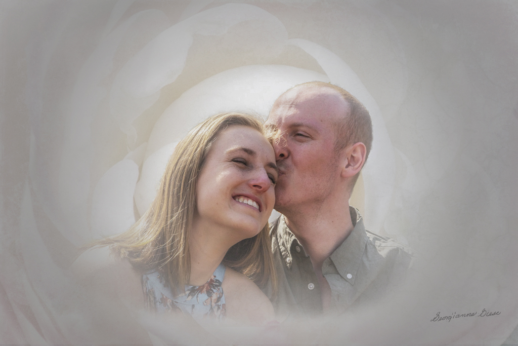 Georgianne, young love always provides an image with lots of possibilities. The use of the camellia blossom was a good choice. I agree with Alan about the hair and Steve that you need for one to be the point of view. The blossom provides an anchoring frame to the couple. The image is overall too bright for my taste. I used your second image and added a slight glow and vignette as well as a B&W layer at low opacity. This brought down the brightness and reduced the sat. |