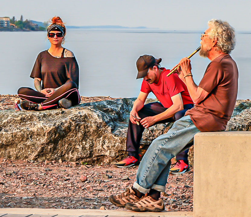 Nice capture, you've not just got the flute player but his entranced audience. I took the liberty of playing with the image, zoomed in on the subjects by cropping the speedboat out, some of the right hand side and a bit of sky. Could also tidy up the foreground perhaps. Then lightened the shadow bits and darkened the highlights. You may disagree of course. |