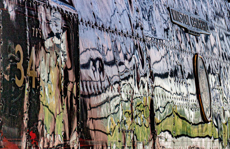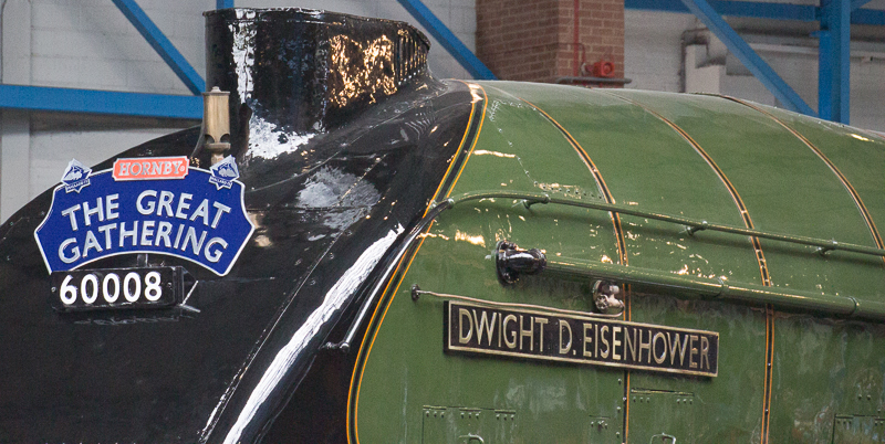 I think the reflections are from an adjacent green painted locomotive |