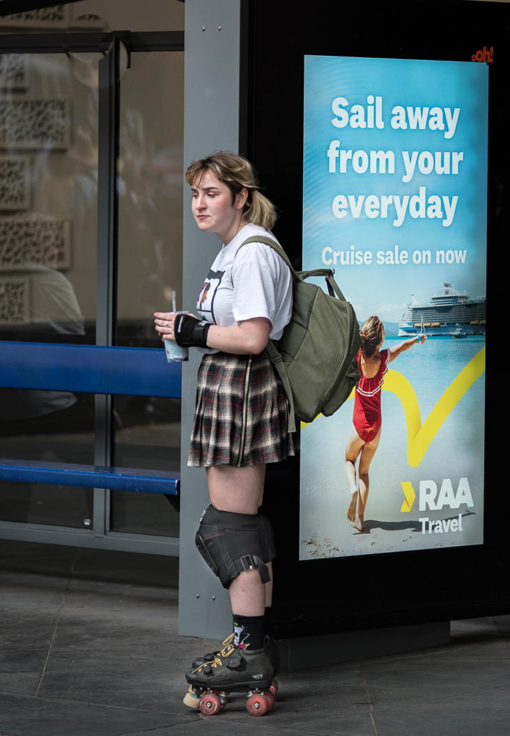 Julie, nice capture of a street scene! The young woman and kthe travel poster do go together. As another variation, I would be tempted to crop in on the right side. Well, I don't think this really does much.
