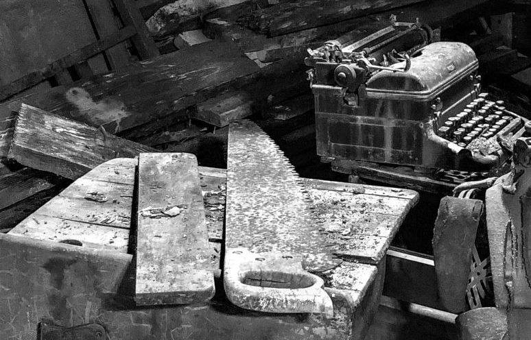 If this were mine, I would be tempted to crop it so the saw blade and the typewriter become a focal point and center of interest. What do you think?
