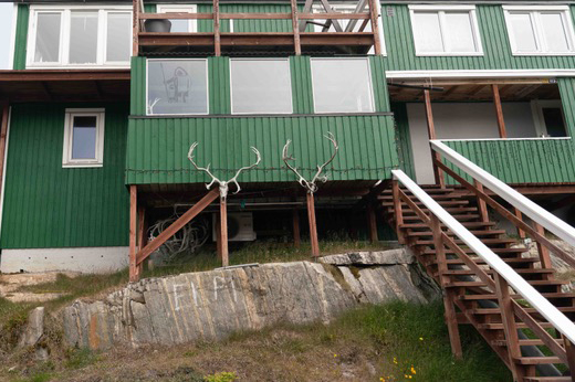 Ling, Ling this image beautifully captures the lives of Inuits in Greenland so I would want to include as much of the milieu as possible. But I would want to delete the blank sky areas as they aren't providing information. I would like to include the stairway as it leads the viewers' eye into the building. I would like to keep the blue boat on the left but that would include some blank sky - thus I would crop in on the left.