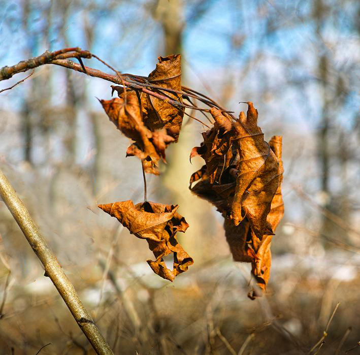 I also agree with all that has been said. With this type of picture, it is difficult to create a simple composition and eliminate distractions. To eliminate distractions in nature pictures, such as this, I carry with me two clothes pins tied to a string. One clip is clipped to a distracting branch or leaf and the other clip to another branch, pulled away from the camera view. Then the branch can be restored to its place without damaging anything. It is not always as simple, but most of the times manageable. I used Peggy's well cloned image to further eliminate other distractions and concentrate on the main set of leaves. I used the Clothing and Spot Healing Brushes.