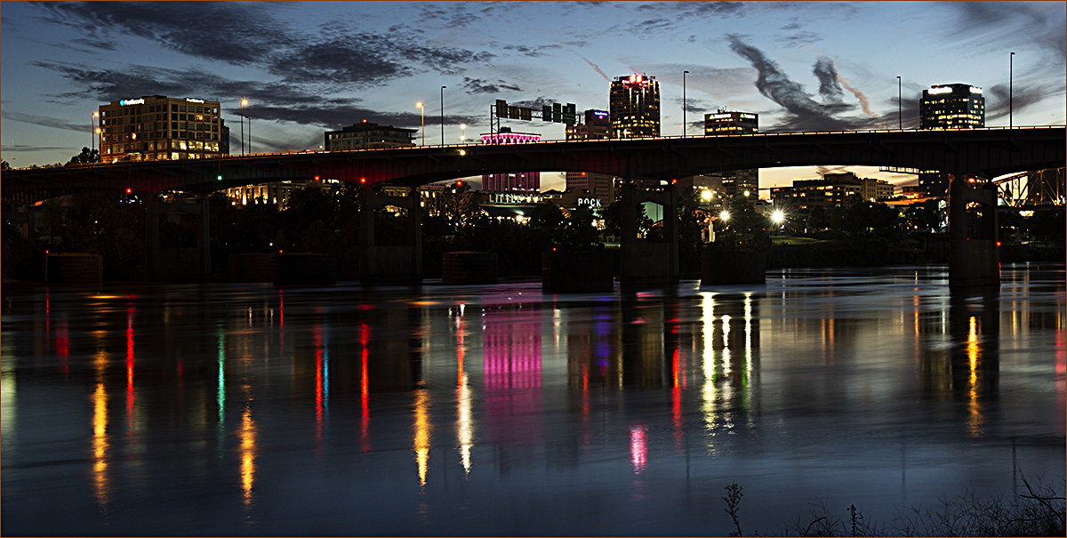 Peggy, this is a lovely, lovely picture and a colorful location, which I hope you have the opportunity to explore in various ways. You chose the best time of the day to photograph, when you still have glow in the sky. I definitely suggest to eliminate 50% of the sky (which is not as interesting as the reflections) and extend the foreground beyond the tips of the reflections; giving you longer leading lines to the subject. Leave the tips of the grass in the right bottom corner in, they fill in the negative space. I would not crop from either side. The longer panel, gives more strength to the image and the reflections on the water hold everything in place. The only thing I would eliminate is the bright sign by the left edge. Needless to say, the unfortunate thing in this image is the overpass or bridge, which does nothing, but damage the scene. Now I suppose that you could get a picture of the buildings from under the overpass/bridge and then superimpose that picture over the overpass, yes?!?