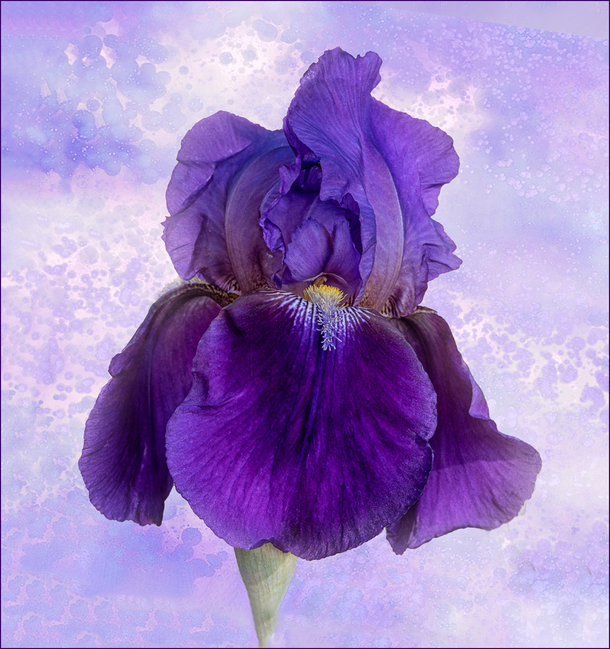 I also agree that your tone combination works very well and especially how the pattern of the background compliments the iris. For me, I need a little more stem and a little tilt to keep the iris from appearing to be static in midair. I extended the canvas a bit and tilted the entire image a bit. Perhaps you may want to consider this in the future.