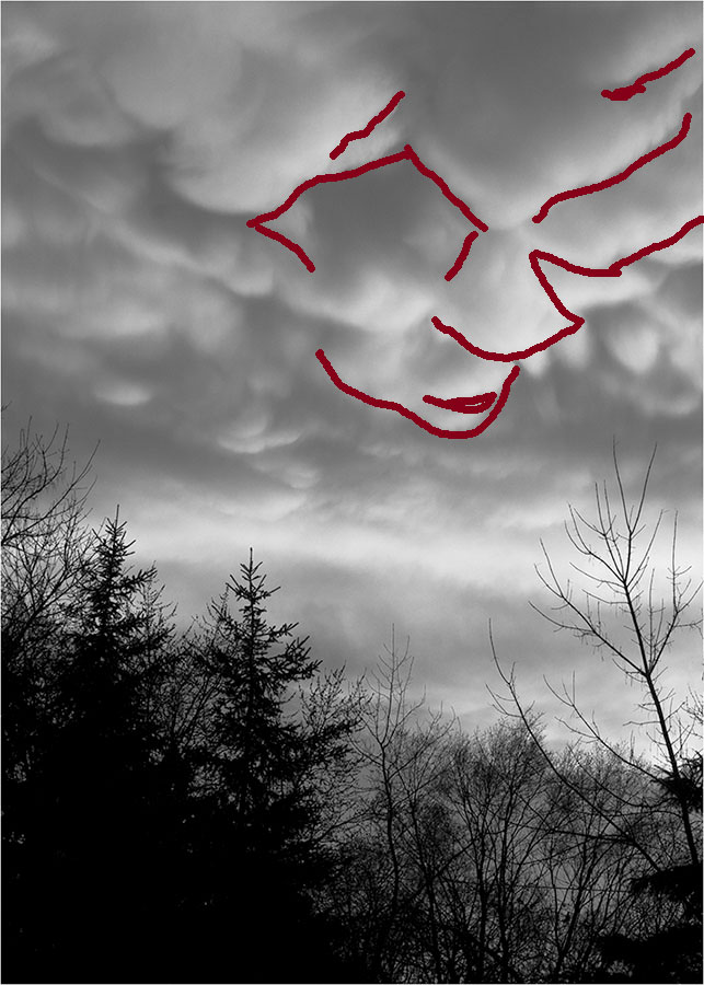 I think Jerry as nailed this image very well. Yes, the B&W does give a very misterious effect. I also have not heard of these clouds, Marti. I am impressed with your knowledge of clouds. I will be looking for them in the future, as well as Jerry's headless horseman. Actually Jerry, I think I have found the face of the horseman in the clouds. I made a rough outline of the face to give you the idea of where the face is, but if you look at it without the outline, you will see what I mean. |