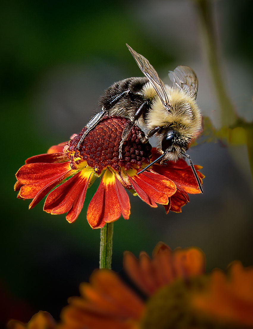 As much as I agree with what has been said, here is how I see this image. I cropped a bit from the top and added a little room on the right. I then removed the distracting leaves near the bee and toned down the flower on the bottom. I think it is a needed secondary element and a good base for the subject. I also brightened the subject a bit. |