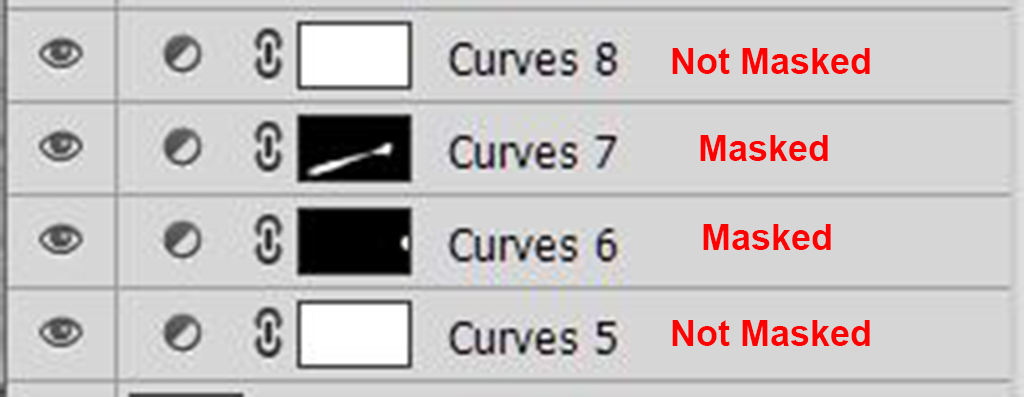 When the masking is complete go back to the Curves Adjustment Layer and tweak the curve to suit and/or vary the opacity of the Curves layer and/or Mask to modify the effect of the adjustment. If processing in Colour set the blending mode of the Curves layer to Luminosity Mode to prevent potentially unwanted colour changes.